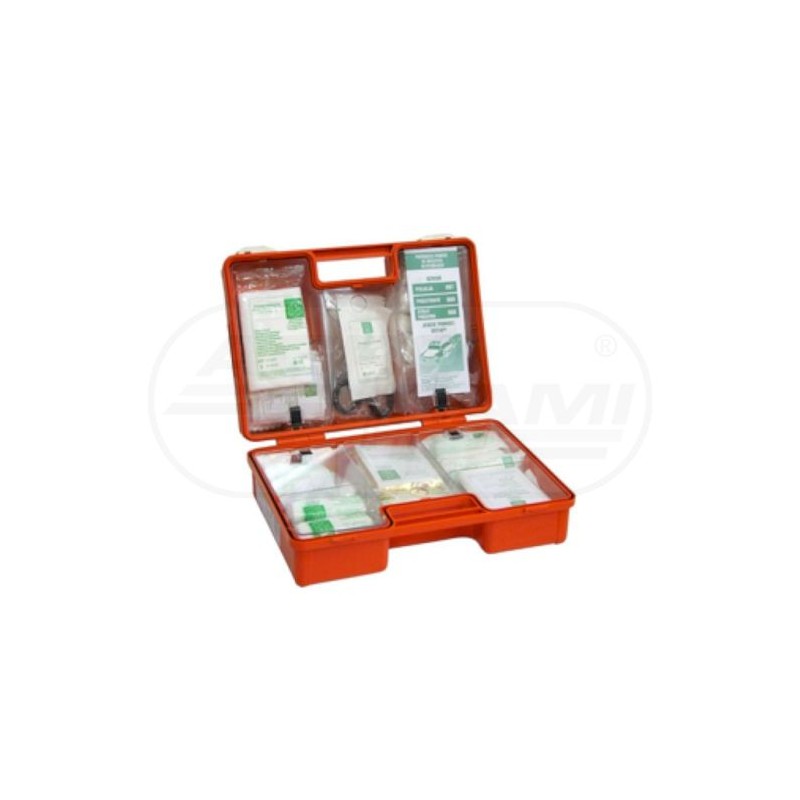 Zastosowanie:  ,przeznaczona do , zakładó,w pracy Specyfikacja: pudełko wykonane zostało z tworzywa sztucznego (polipropylen) posiada uchwyt do ,zamocowania na ścianie wbudowana rączka do wygodnego przenoszenia termin ważności produktó,w sterylnych wynosi 5 lat wyroby medyczne oznakowane są znakiem CE spełnia wymagania normy UE opakowanie: karton kolor apteczki: pomarańczowy 1 PLASTER NA SZPULCE 5m x 2,5cm 1 szt. 2 ZESTAW PLASTRÓ,W (5 RODZAJÓ,W)  , 42 szt./1 opak. 3 BANDAŻ Z KOMPRESEM (opatrunek indywidualny) 6x8cm 1 szt. 4 BANDAŻ Z KOMPRESEM (opatrunek indywidualny) 8x10cm 3 szt. 5 BANDAŻ Z KOMPRESEM (opatrunek indywidualny) 10x12cm 1 szt. 6 CHUSTA OPATRUNKOWA 60x80cm 1 szt. 7 KOMPRES NA RANY 10x10cm 6 szt./3 opak. 8 KOMPRES NA OKO 5×,7,5cm 2 szt. 9 ZIMNY KOMPRES  , 1 szt. 10 KOC TERMICZNY (ratunkowy) 210x160cm 1 szt. 11 BANDAŻ ELASTYCZNY 4m x 6cm 2 szt. 12 BANDAŻ ELASTYCZNY 4m x 8cm 2 szt. 13 CHUSTA TRÓ,JKĄTNA 96x96x136cm 2 szt. 14 NOŻYCZKI  , 1 szt. 15 WOREK FOLIOWY  , 2 szt. 16 CHUSTA Z FIZELINY 20x30cm 5 szt./1 opak. 17 CHUSTECZKI NASĄCZONE  , 4 szt. 18 RĘKAWICZKI JEDNORAZOWE  , 4 szt. (2 pary) 19 MASKA MEDYCZNA  , 2 szt. 20 INSTRUKCJA UDZIELANIA PIERWSZEJ POMOCY  , 1 szt. 21 APARAT DO SZTUCZNEGO ODDYCHANIA  , 1 szt.