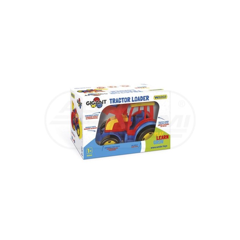 Masywny, duży traktor – ładowarka o długości 60 cm o realistycznym wyglądzie. Ruchoma łyżka traktora może służyć jako spychacz bądź ładowarka, co uatrakcyjni zabawę. Olbrzymią zaletą pojazdu jest solidność wykonania, trwałość i wytrzymałość konstrukcji. Gigant Traktor Ładowarka został wykonany z najwyższej jakości, bezpiecznego i nietoksycznego tworzywa odpornego na każdą pogodę.